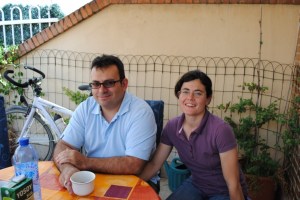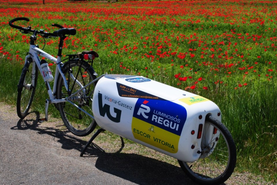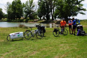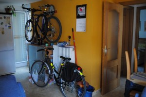 La entrada a Huesca guiados por Samuel evita todo el trafico. Huesca es una ciudad pequeña, 50000 habitantes y se puede decir que casi casi la cruzamos para llegar a casa de Samuel. Él es la «cabeza» visible de Huesca con Bici y nos aloja en su casa sin reparos. La foto recoge el lugar donde deja él y su novia Maite las bicicletas. Y es también un ejemplo de que la bici puede ser un objeto util más que un estorbo.