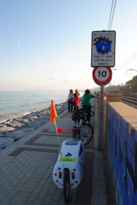Actuaciones criticables como esta. Vamos por el paseo marítimo, a unos 20 km del centro de la ciudad y aparece una señal que indica que las bicis pueden circular por dicho paseo. A menos de 100 mt. un señal prohibe transitar a las bicis. Resulta que en ese espacio estamos cambiando de municipio y cada uno aplica «su ley». Sin mucho sentido. Otro ejemplo de falta de comunicación y voluntad política.