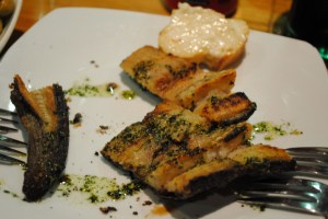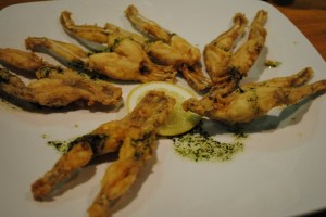 Y en el bar de Tomas nos comemos dos platos típicos de la zona: ancas de ranas y anguila. El dueño nos relata recuerdos de hace décadas cuando la Angula no era apreciada y se utilizaba como condimento o incluso para alimentar a las gallinas. Recuerda que había muchas ranas y que cogerlas era sencillo.