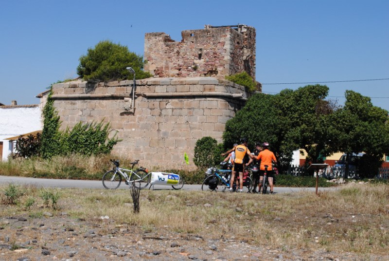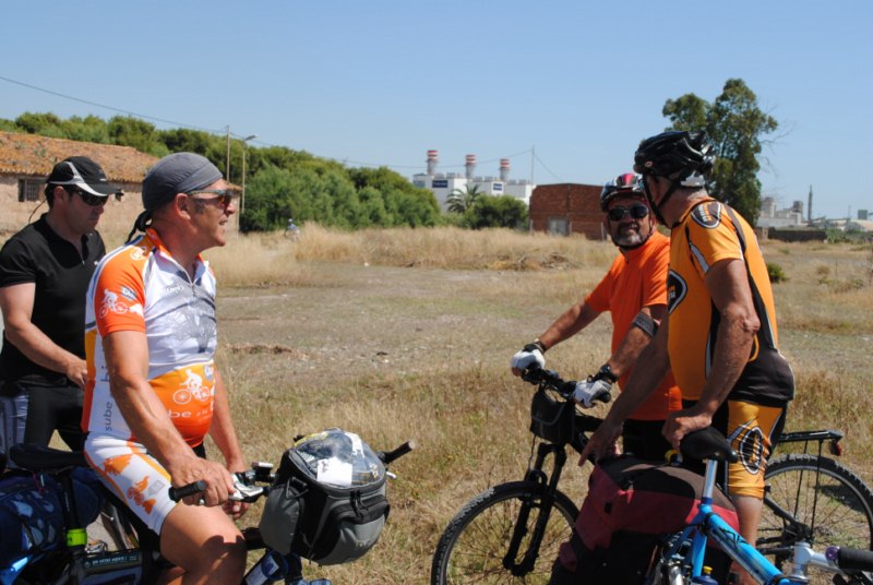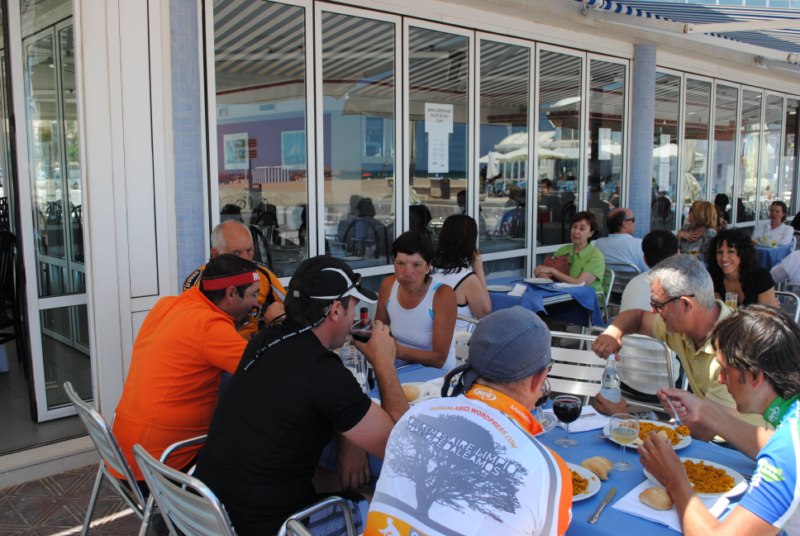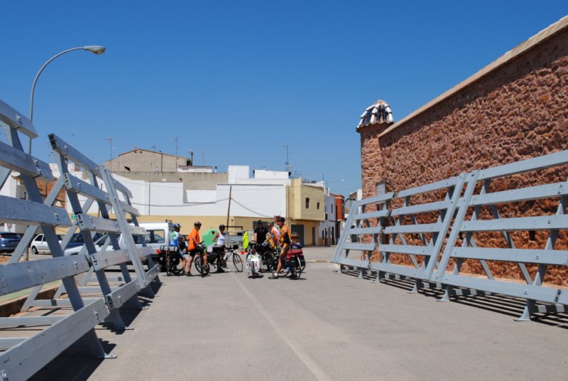 La foto esta tomada en el Camping de la Malvarrosa de Corinto junto a la gerente y parte del personal. Destacar el menu (calidad/precio). Cuando comencé a desmontar la tienda de campaña (el último para no variar) apareció Manuel. Él es un cicloturista que se puso en contacto a través de la pagina de bicigrino y desde hace casi mes y medio nos cruzábamos algún e-mail. Finalmente hemos podido encontrarnos en el camino. Se ha acercado esta mañana para guiarnos hasta Valencia.