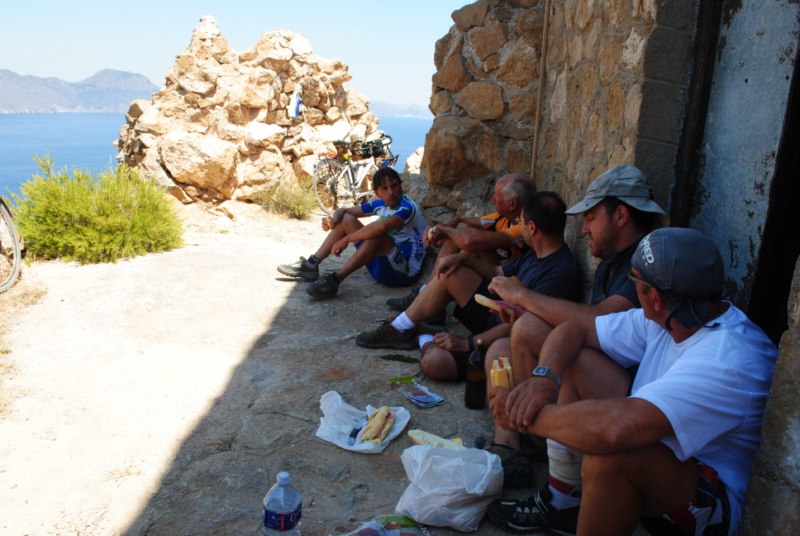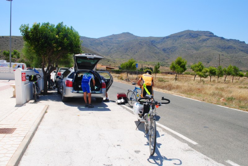 Bueno como todo viaje, todo tiene un inicio y un fin. A la entrada de Mazarron, Miguel y Juanlu se despedian. Ellos comenzaban a rodar con más fuerza porque deben de coger el bus en Almeria. El regreso les acecha. Las despedidas son duras. Y esta vez algo más. En primer lugar porque con Miguel ya había viajado y en segundo lugar porque la presencia de Juanlu en esta aventura y su aporte al grupo ha sido tremendo. No vamos a olvidar las arrancadas con chistes y canciones. Quedan recuerdos como los de la barcaza en el Delta del Ebro o los canticos en el Teatro de Sagunto.