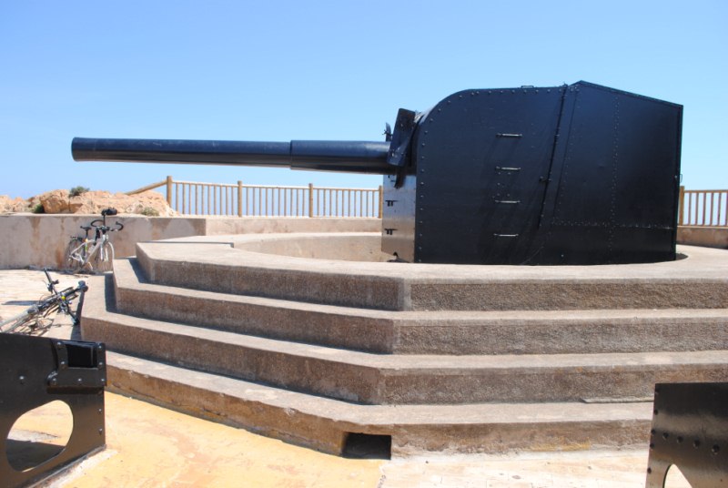 Ayer por la tarde, durante la charla y después, en el paseo en bici por las calles de Cartagena Cristobal se ofrecio para guiarnos hasta el Cabo Tiñoso. Arriba en la cima se encuentran unos grandes cañones que se utilizaron sobre todo en la guerra civil española.