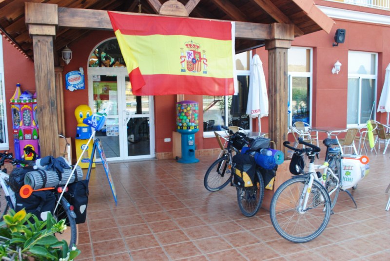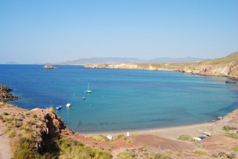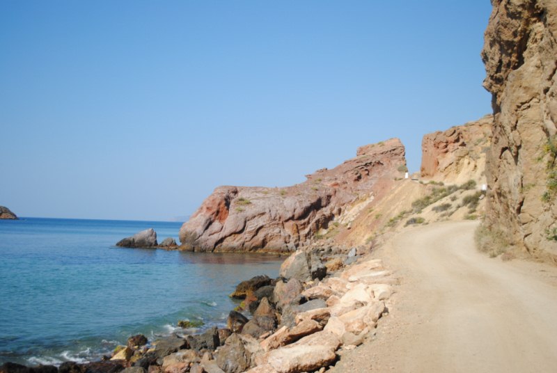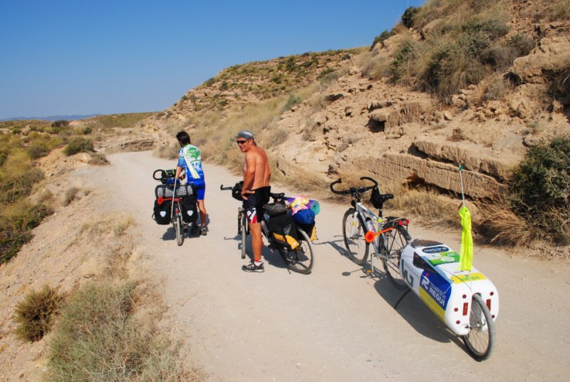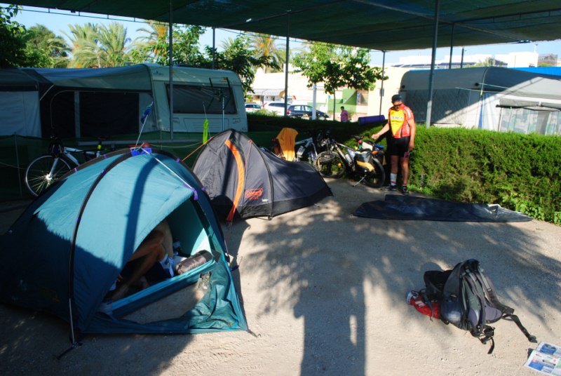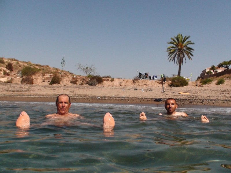 Salimos del camping y en seguida enganchamos un camino de parcelaria que recorre la costa. Durante umos diez kilómetros pasamos por un monton de calas de aguas cristalinas y con una buena temperatura. Este camino va desde Bolnuevo hasta Cañada de Gallego. Estas calas son nudistas.