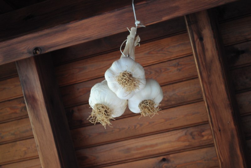 Estos ajos que cuelgan de la entrada del bar son de un tamaño mayor que un puño.