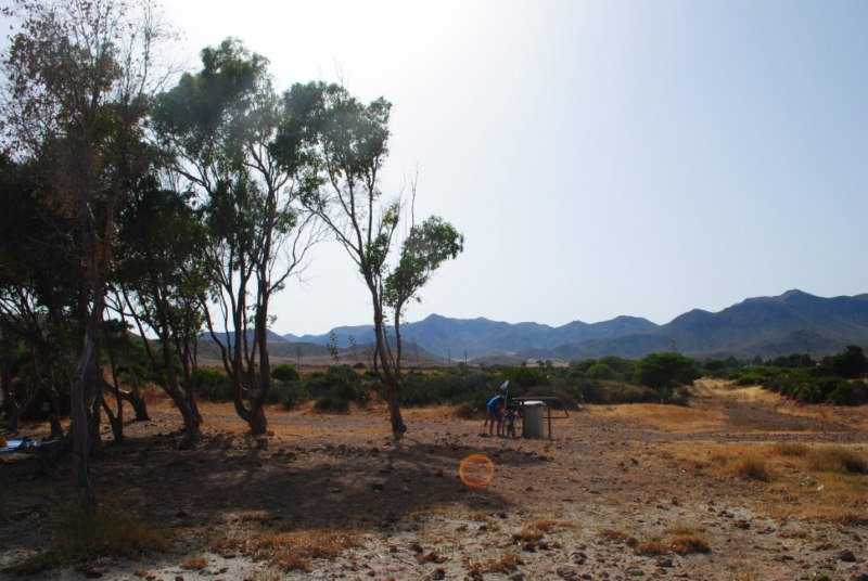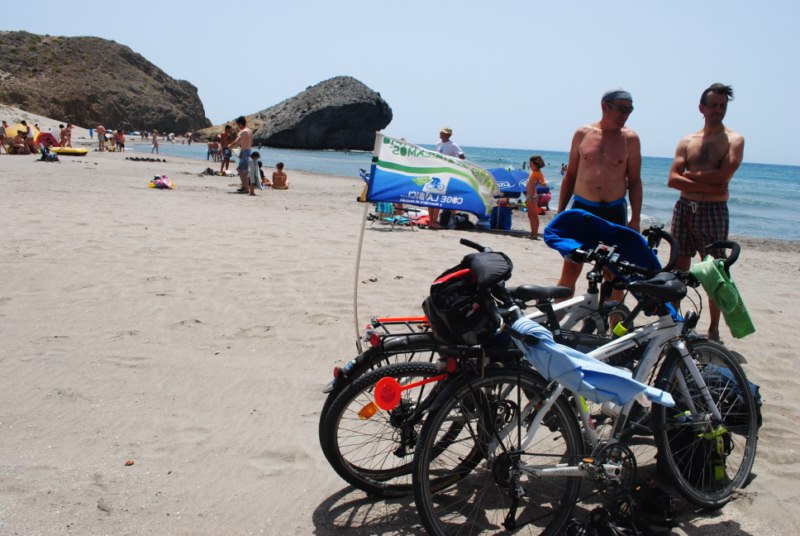 Salimos del camping de Los Escullos y nos despedimos de Antonio Soler, el responsable del camping. Sabemos que la etapa de hoy es corta pero es uno de los días que más pronto comenzamos a pedalear… solemos hacer cosas extrañas.