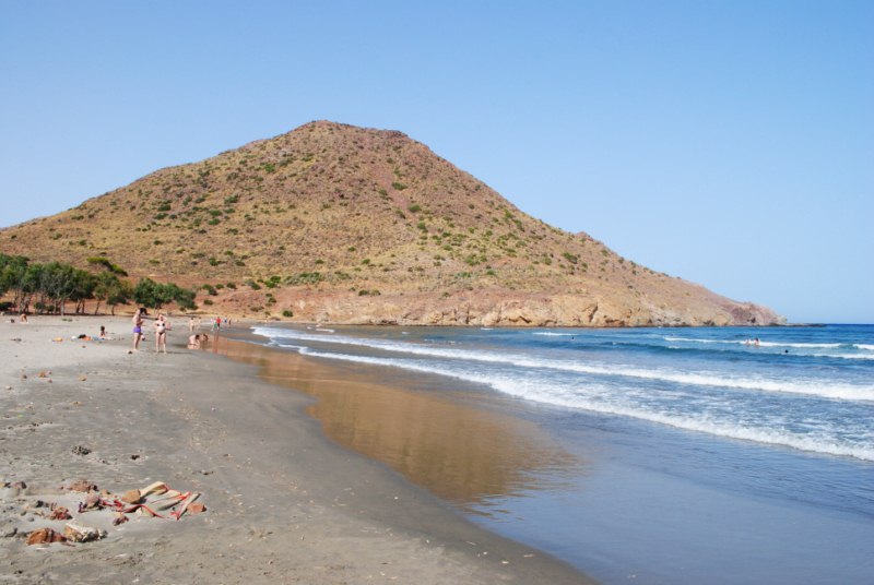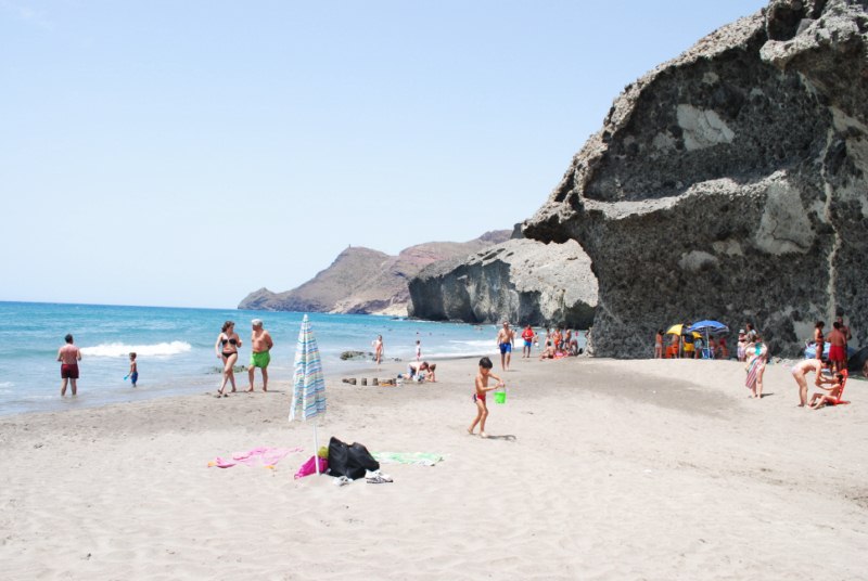 Después de montar las tiendas de campaña cogemos lo justo y salimos hacia la playa de Monsul, la más lejana desde San José. En realidad dista unos 6 km. y se accede a través de una pista sin asfaltar. Cruzamos el desvío que va a parar a la otra playa que visitaremos por la tarde «la de los Genoveses». En la playa de Monsul se han grabado varias películas pero lo mejor es que aquí se grabaron algunos capítulos del Gran Curro Jimenez. !Que grande! Curro, la bruja avería, Verano Azul, naranjito, Felix Rodriguez de la Fuente…