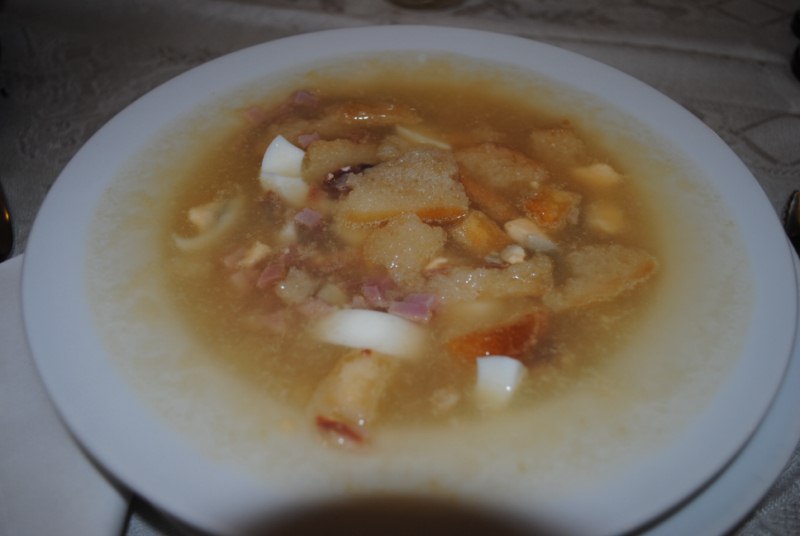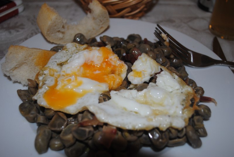 Antes de comenzar la búsqueda de los conocidos para a probar una sopa de miga y unas habas con bacon y huevo de segundo.