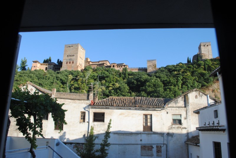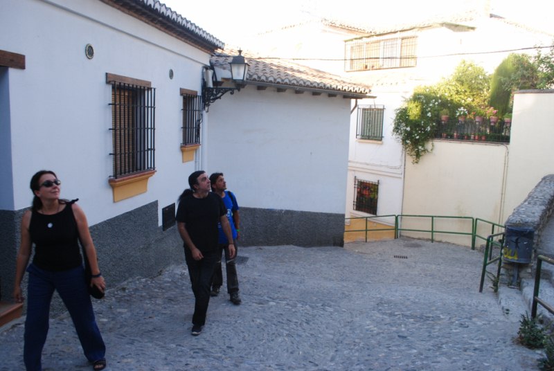 Después de comer comencé a dar tumbos por el Albaycin bajo pero no era capaz de encontrar ningún dato que recordase mi visita anterior. Comencé a preguntar en tascas y tiendas por si les conocían pero no tuve suerte. Entonces recordé que había sacado fotos de la zona con ellos y Miguel Soroa en las cercanías de su calle. Solo tenía que sacar el portátil y comenzar la búsqueda. Y los encontré. Con la referencia de una foto desde la ventana de la casa hacia la Alhambra y con una de la fachada del vecino me lance a recorrer las calles donde pensaba que vivían. Y efectivamente, llame a una puerta y aparecieron Pepelu y Paz.