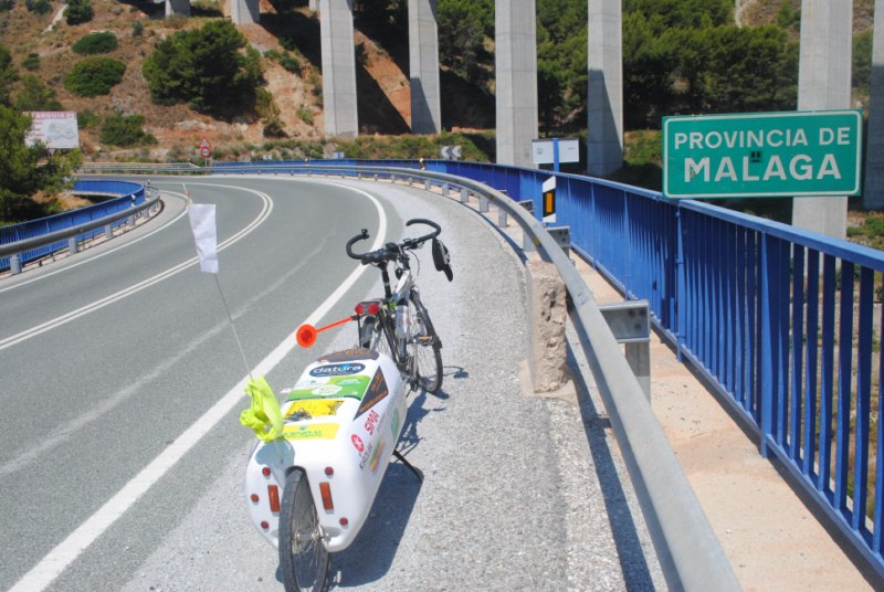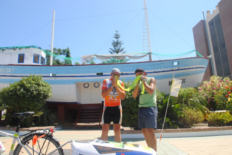En Malaga hemos quedado con Gregory, un conocido de Miguel Soroa. Greg se vino desde Londres hasta Malaga con la bici. El lugar de encuentro es la tienda que regenta, http://www.recyclobikeshop.es/. Cuando ya nos pasábamos la tienda nos topamos con dos curiosos que nos preguntaron de donde veníamos, cuanto tiempo llevábamos etc etc. Resulta que eran socios de Ruedas redondas, la asociación de usuarios de la bici en Malaga.