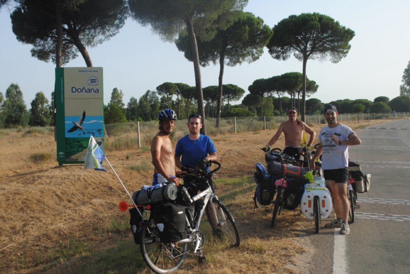 Una recta de más de siete kilómetros nos acerca al Rocio. Acampamos en el camping La Aldea, en la entrada a El Rocio. Después de la ducha y de la cena me acerco con Miranda a ver el pueblo. Son la tres menos cuarto de la madrugada pero no tenemos sueño. Sacamos unas copas y aprovecho para escribir. Llevamos más de hora y media anclados en el un bar con una música que comienza a ponerme nervioso. No es flamenco. Es como un erre que erre, erre que erre donde la palabra Pasión, Rocio y Camino esta presentes en todas las canciones. Me da ganas de salir corriendo, enganchar el primer caballo y no parar hasta cansar al equino. Pero bueno para gustos musicales… yo lo siento pero con esto solo puedo un poquitin.