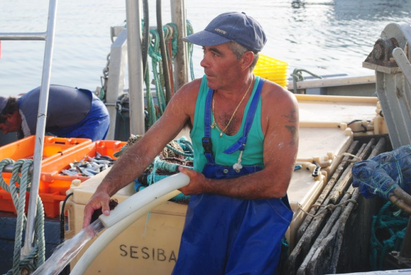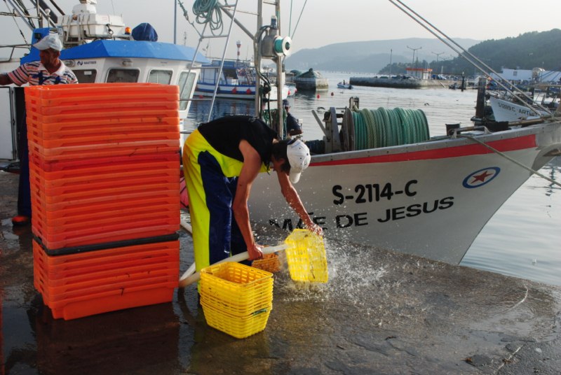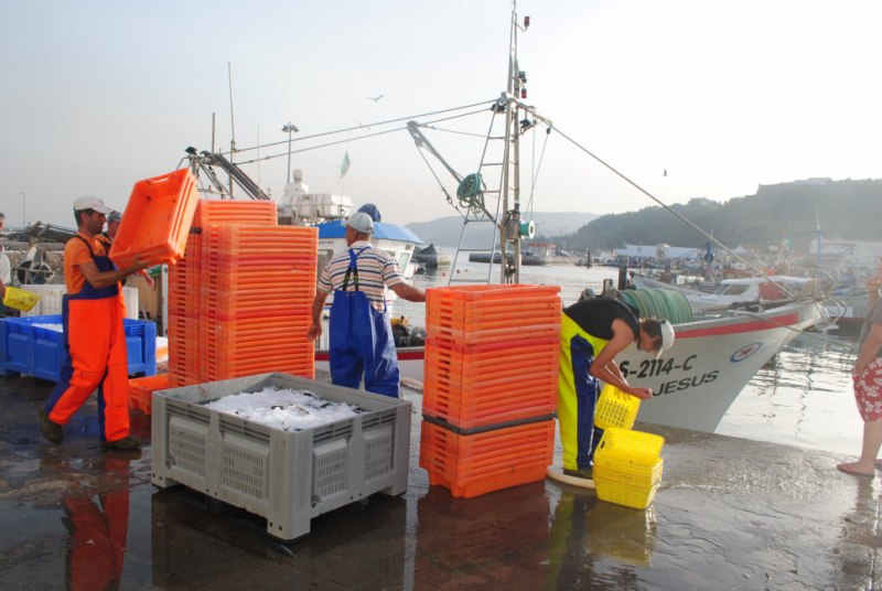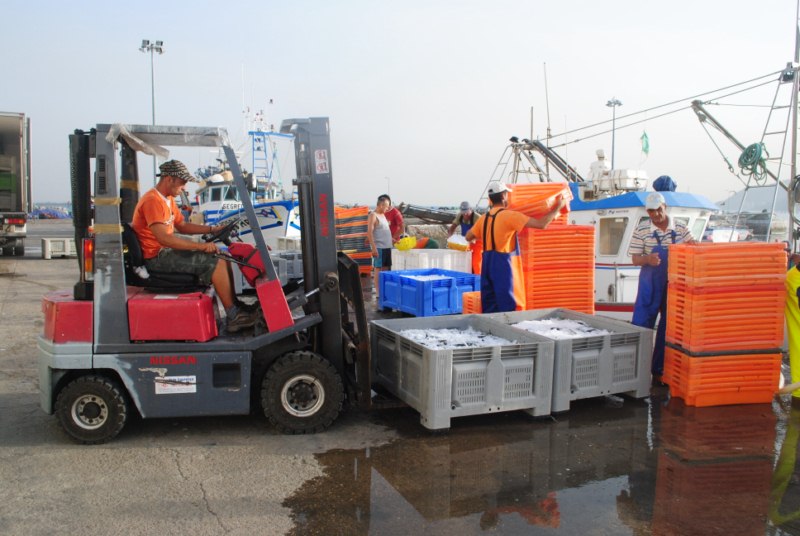 En el puerto comienza una frenetica descarga del pescado que acaba en unos minutos. Algunas personas sacan del barco el pescado mientras otras se encargan de vertir hielo a los recipientes. Otro se encarga de subir los palets a un camión. Y mientras unos hacen esto y otros lo otro parte de la tripulación limpia el barco. Es un trabajo bien organizado.
