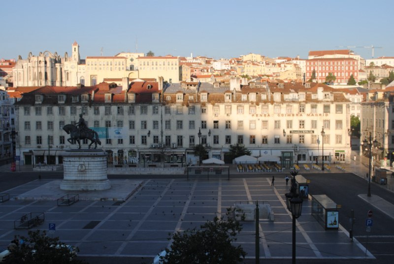 Madrugamos. Esta es la vista desde nuestra habitación en la pension Iberica, en la praca Figueira de Lisboa. A las siete y media de la mañana solo se ve alguna persona andando y los repartidores. En cambio anoche a eso de la una de la madrugada la plaza tenía «vidilla». Algunos grupos de turitas de un lado hacia otro, algun golpeado, los taxis y alguna puta frecuentaban el lugar.