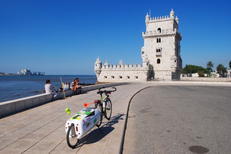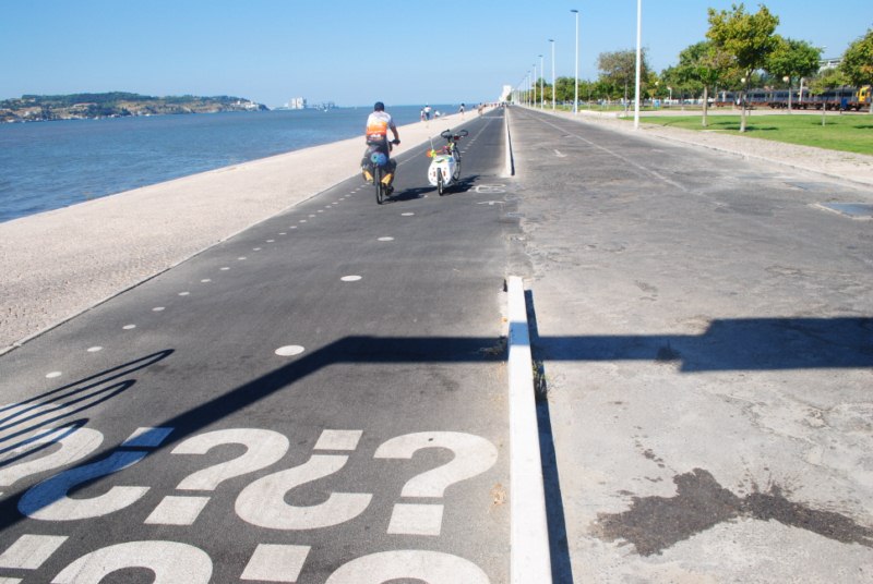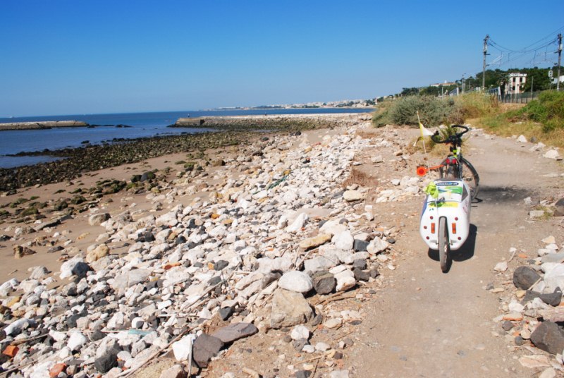 Salimos de Lisboa a través del bicicarril que une el embarcadero con Belem. Son cerca de siete kilómetros de carril junto al Tajo. A partir de Belem la cosa se complica porque hay dos opciones. Una es la de seguir por un camino arenoso y la otra es la de transitar por la calzada. Al principio cogemos un sendero que va entre la linea de agua y el ferrocarril pero tiene piedras y arena y dificulta el paso así que optamos por salir a la carretera. Tiene mucho trafico y un carril estrecho. Es sabado y no se ve mucho trafico pero no podemos imaginar lo que puede ser esto entre semana.
