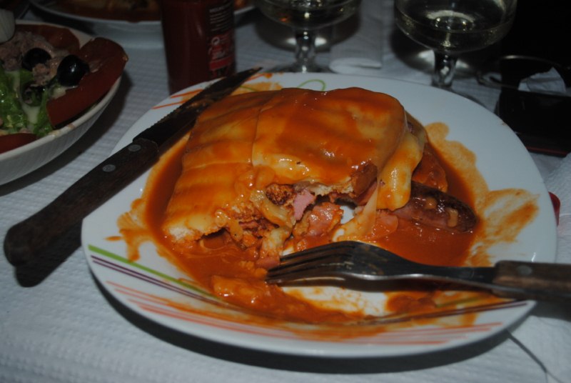 Esto es una Francesiña, un plato típico de Portugal. Contiene queso, chorizo, bacon, lomo, rebanadas de pan…