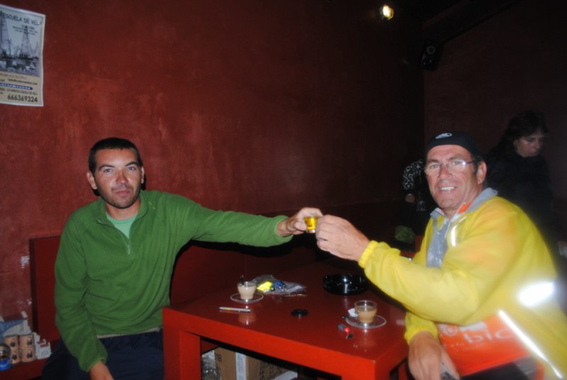Un brindis con chupitos de hierba. La excusa podría ser el llegar a Finisterre pero el secreto era que teniamos frioy esto podía calentar algo nuestros cuerpos humedecidos desde hacia un buen rato.