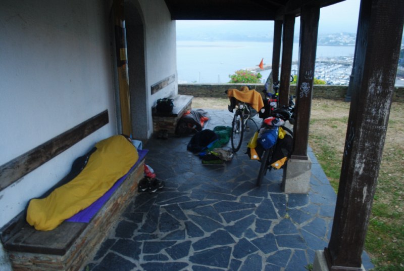 Con todo ello decidimos buscarnos la vida y dormir en la calle. La acampada esta prohibida. Al final nos quedamos a dormir en el portico de una Ermita. Miguel se quedo dentro del albergue, en el suelo pero a refugio. Nosotros a la intemperie. De hecho Artu T. nos dijo que paso frio.