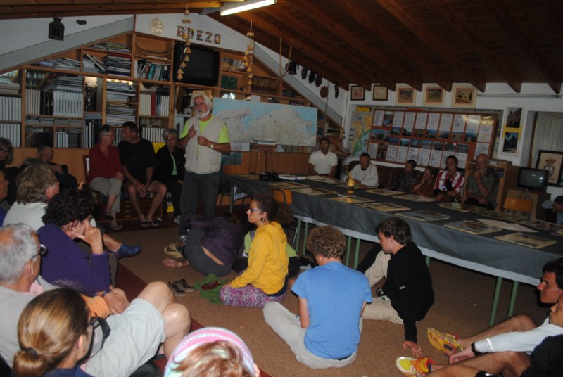 Cuando llegamos Ernesto, el hospitalero da los detalles de las proximas etapas. Detrás de él hay un buen mapa del camino. Dos peregrinas le traducen al ingles, al alemán o al frances las explicaciones. Después nos vamos todos a cenr una sabrosa sopa de fideos y Sorropotun (el marmitako en el País Vasco).