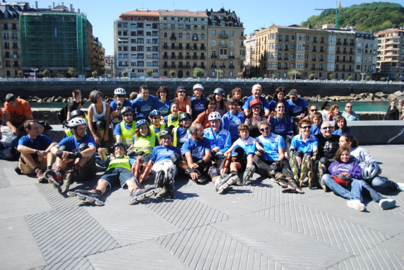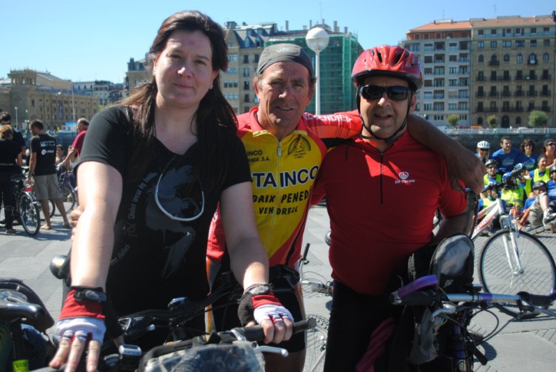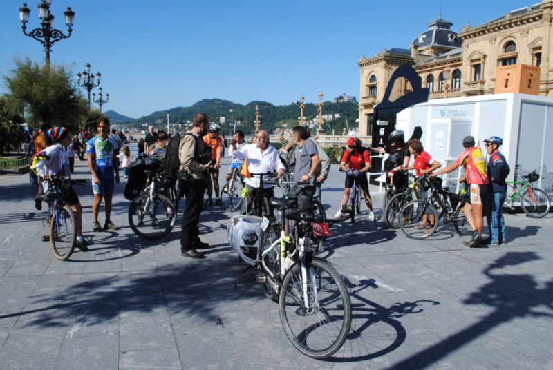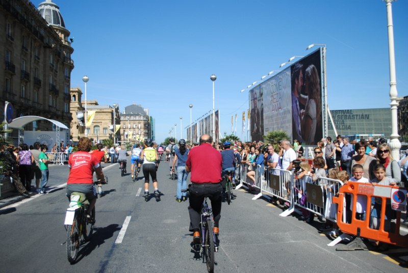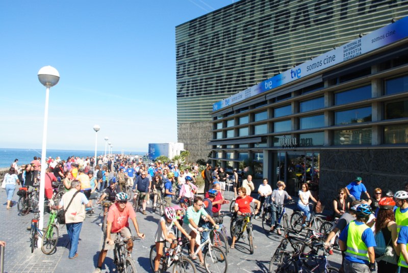 La marcha en Donosti se convierte en la fiesta de la bici. La asociación Kalapie, que viene desde hace tiempo trabajando en el tema de la bici como un medio habitual tiene fuerza en San Sebastian y eso se ha reflejado hoy. A pesar del festival de cine y de que los medios de comunicación no le han dado caña a la marcha han conseguido reunir al menos a ciento cincuenta personas.