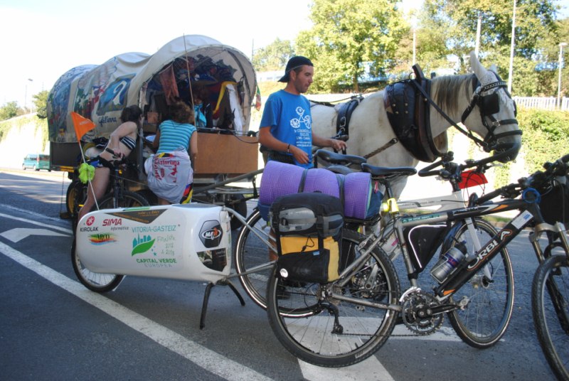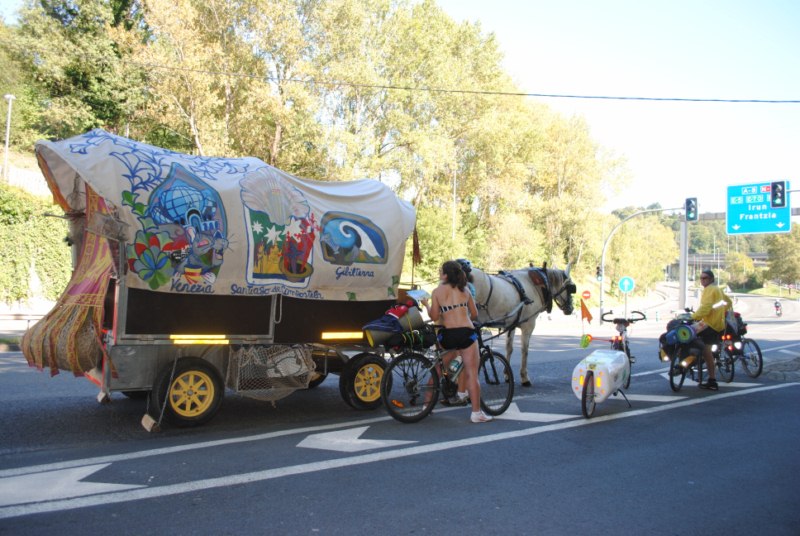 … otra sorpresa. En una vía rapida, de repente nos topamos con una carroza. Una peregrina que viene desde italia a una media de 25-30 km. al día.