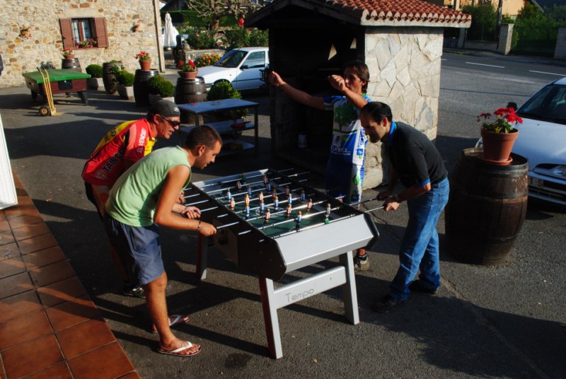 Jugando unas partidicas al futbolin en Larrea.