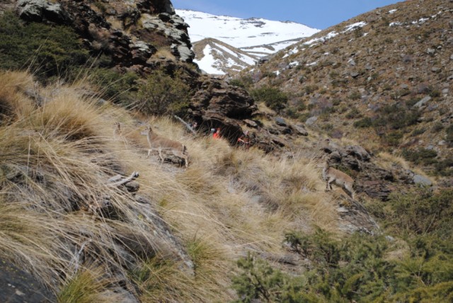 No muy lejos de la central eléctrica en la ladera de enfrente observamos un grupo de 35 a 40 cabras montesas. Estan acostumbradas y no dudan en atravesar el camino por el que ascendemos.