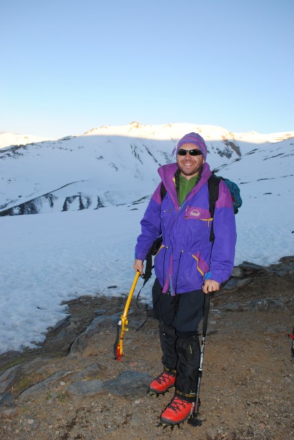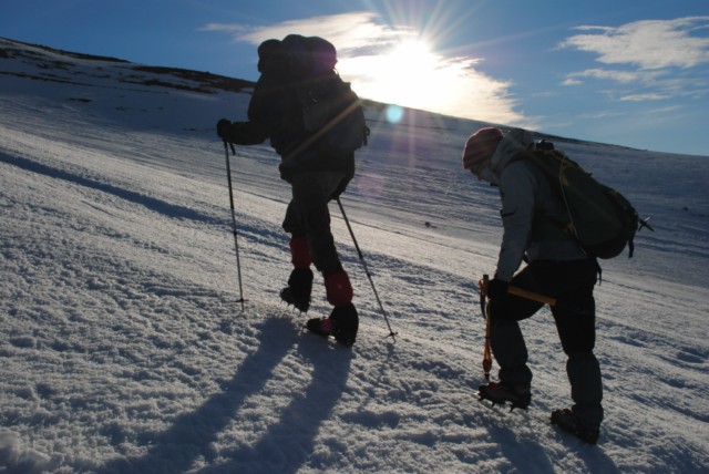 La primera vez que me veía con crampones y con bastones. Alguno ya me dijo que se veían a pocos montañeros con bañador en pleno invierno. Pero lo cierto es que debajo llevaba un térmico.