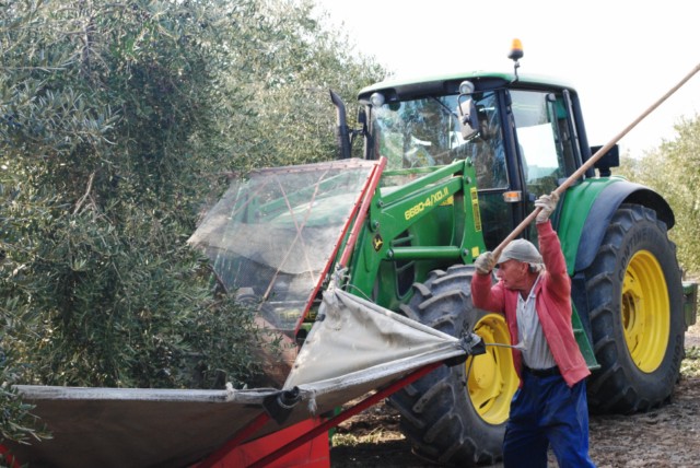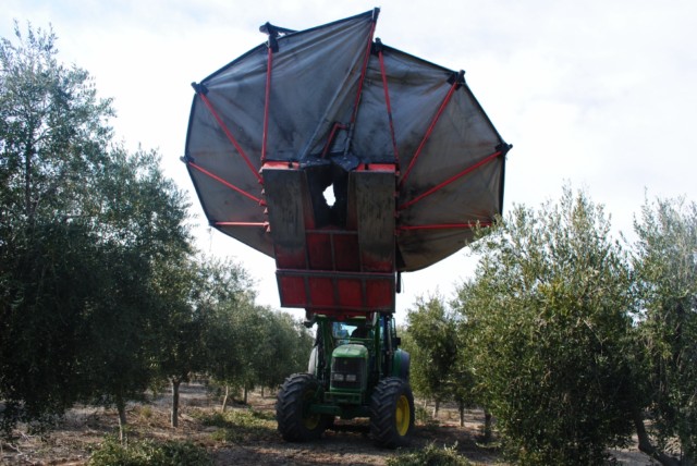Recogida de la aceituna. Con el aparato del tractor se hace vibrar al olivo para que caigan las aceitunas.