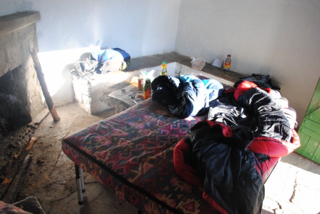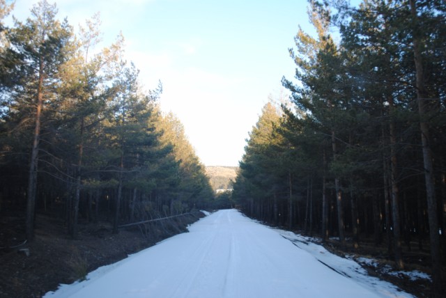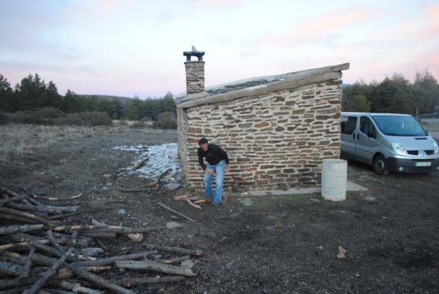 Al borde de la carretera aparece un refugio de montaña. Las puertas abiertas, el montón de leña junto a el… nos quedamos. Encendemos la fogata y bajamos el sofá cama de la furgo. Podemos hacer noche y dormir a resguardo, calientes y cómodos. Estamos a unos 1900 mt. de altitud y en las umbrías todavía queda nieve. Esta es la zona conocida como Calar Alto.