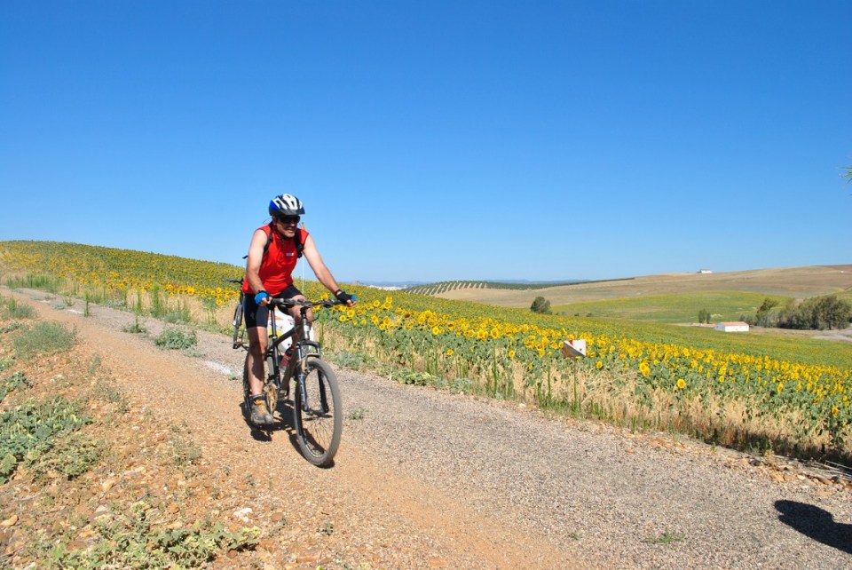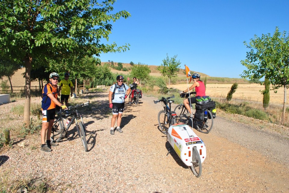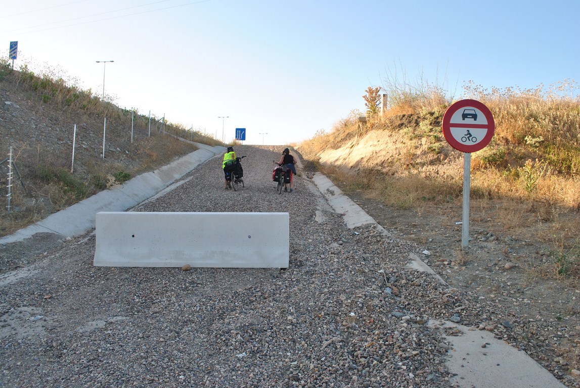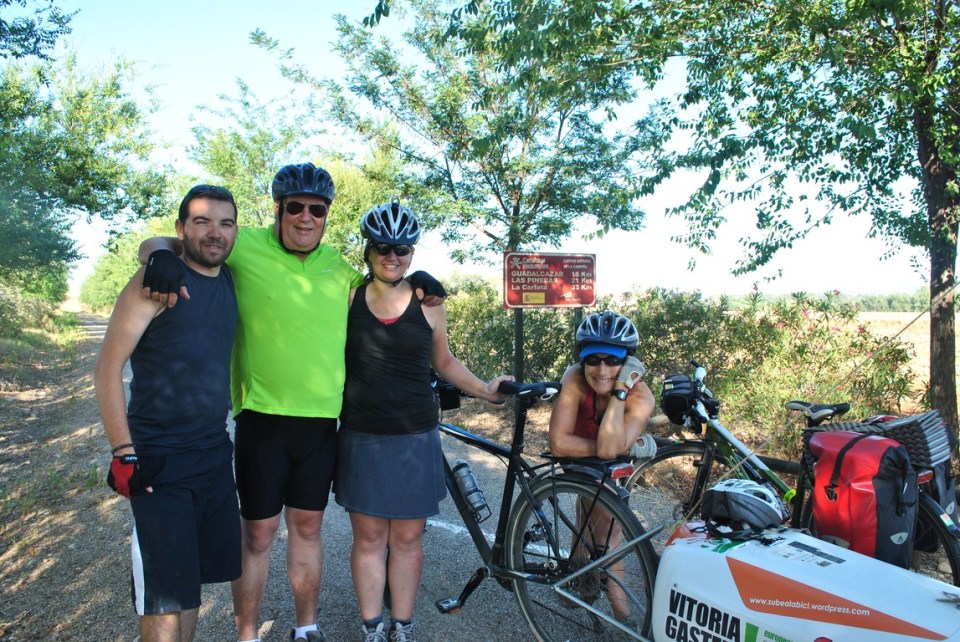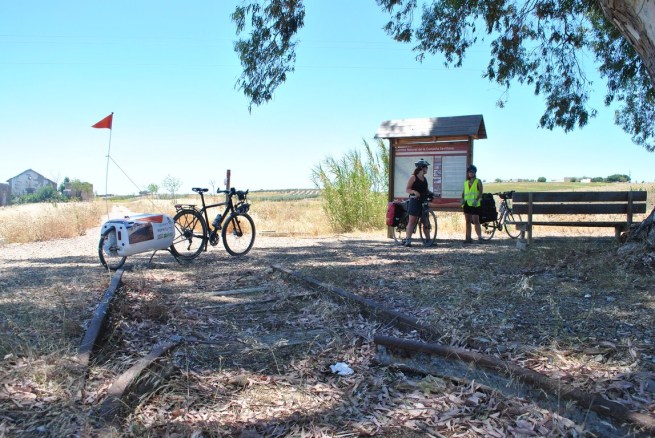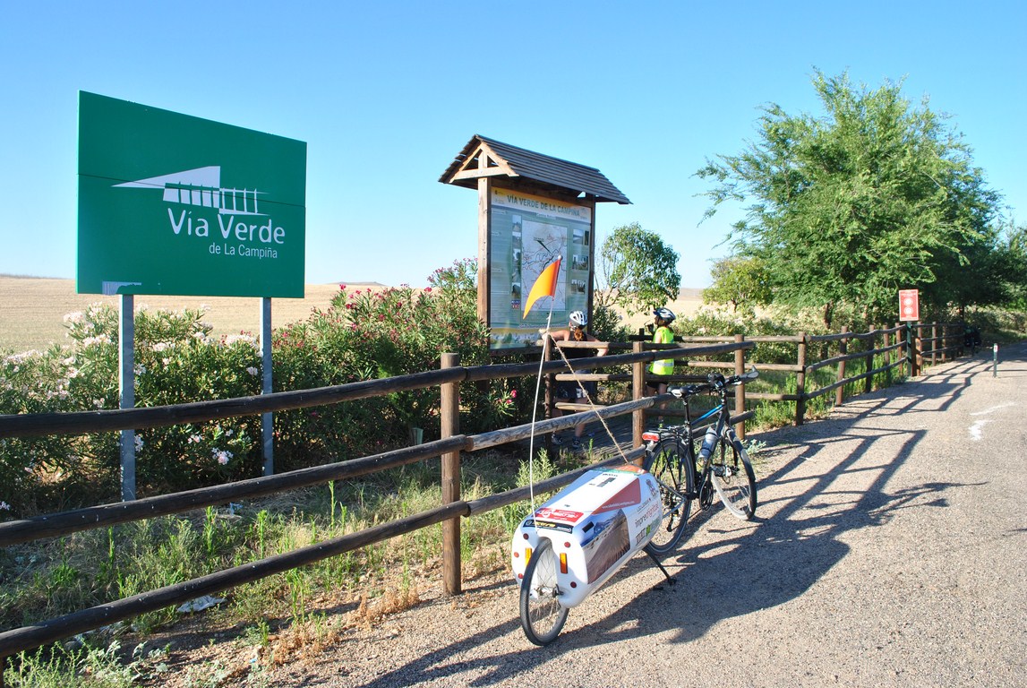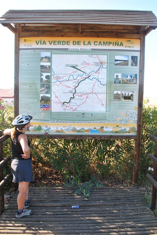 Alcanzamos la Vía verde con ciertos problemas. No está señalizado nada sobre como llegar a ella en la ciudad de Cordoba. La vía tiene el inicio en Valchillon pero de esta referencia queda poco o nada. En Cordoba nos liamos y cogemos otra dirección. Pero no pasa nada. Volvemos a pasar frente al Pabellon y continuamos hacia el río. Despues de cruzarlo giramos hacia la derecha (o sea el margen izquierdo del Guadalquivir) y nos vamos dirección Guadalcazar. A pocos kilómetros hay un silo de cereal. Es en ese punto donde comienza la vía Verde. En ella nos topamos con Paco, un cordobés que durante más de 15 años vivió en Legutiano, una localidad cercana a Vitoria-Gasteiz.