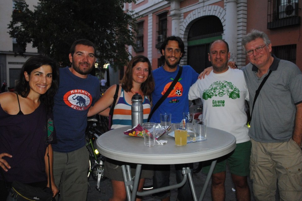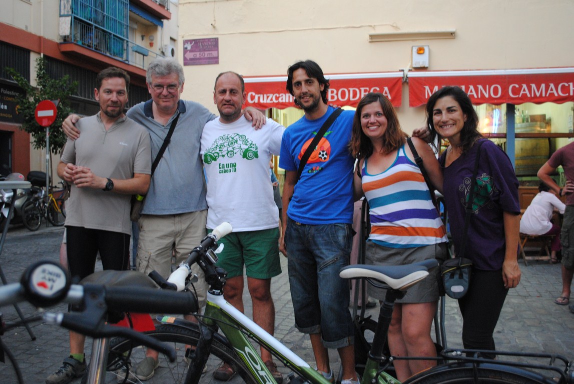 Los de la foto son miembros de Acontramano, la asociación que desde 1987 defiendo los intereses de los usuarios de la bicicleta y de los peatones. Podriamos decir que ellos son parte importante de que las cosas «rueden» mejor que hace unos pocos años en Sevilla porque debemos decir que hace diez años no había practicamente ni un bicicarril en Sevilla y en la actualidad es una de las ciudades con más movmientos en bici por día de toda la península. Sevilla como ejemplo decir que ha sido la ciudad donde tuvo lugar el congreso ibérico de la bicicleta en el 2010 y sede de la Velocity en el 2011.