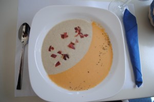 Comemos con Emilio y Yolanda en el tren… ¡Qué bonito para comer y alojarse! Se trata de un alojamiento singular y hasta ahora, es el que más nos ha llamado la atención.  Nos encanta la sopa fría de champiñones y tomate, así como la ensalada de pimiento, el cochinillo y el escalope de ternera. Con comidas como ésta nos subimos a la bici más que felices…