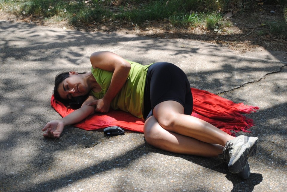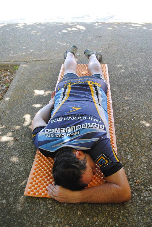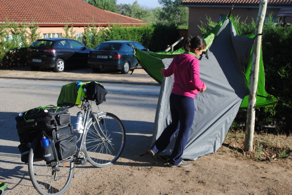 Mari Carmen con la tienda de campaña buscanso el sol para secarla.