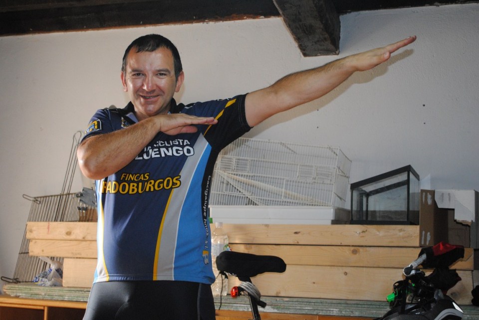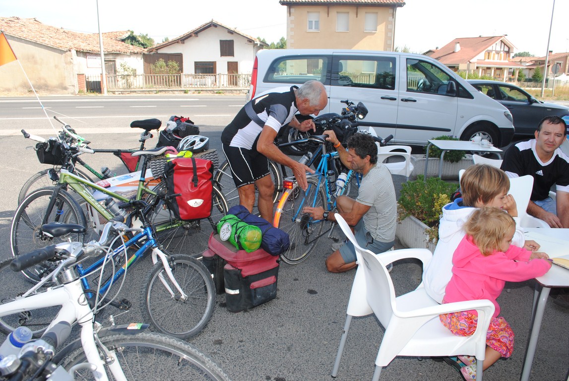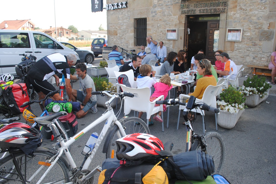 Tenemos tiempo para desayunar en un bar. A los dos minutos aparece «El Casero», el bombero que conocimos en Herredia y que entre otras cosas ha hecho 600 km en 24 horas y el camino de Santiago en dos días y medio. Él pregunta por Sole y Artu que se perdieron en la etapa Acedo-Larrea durante 4 horas.