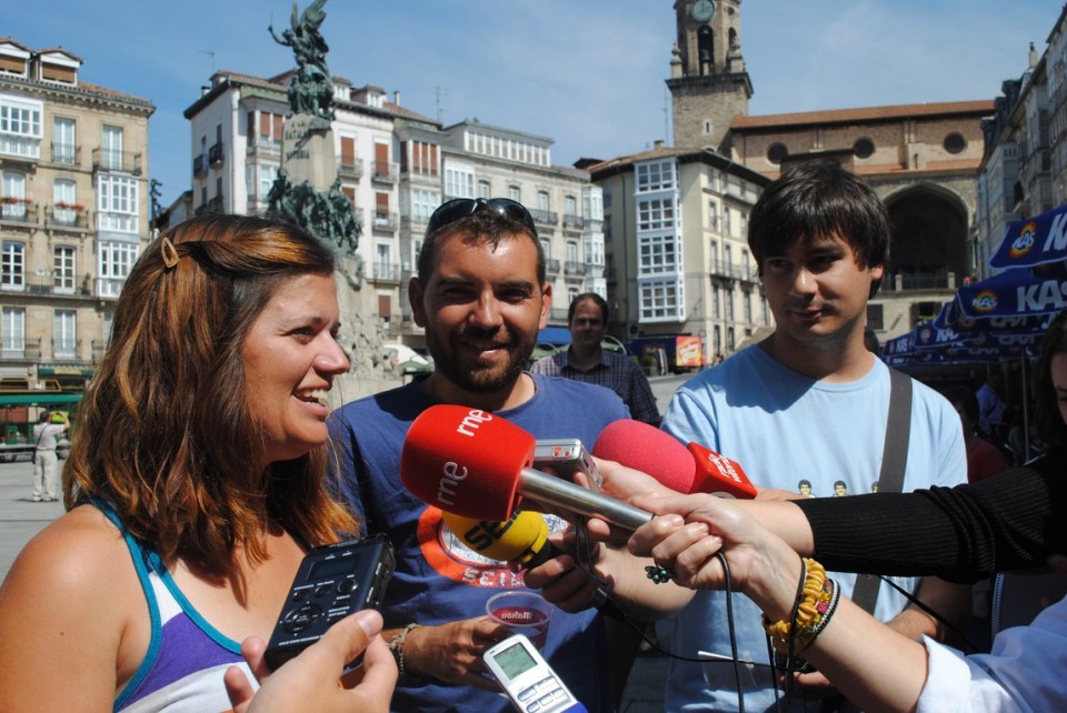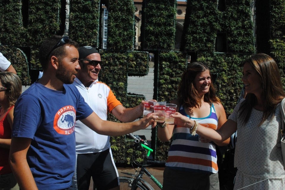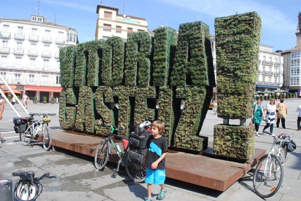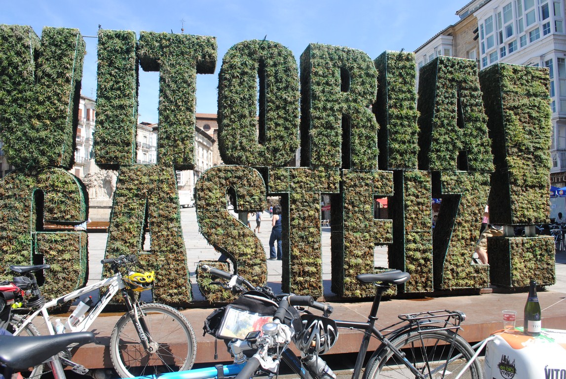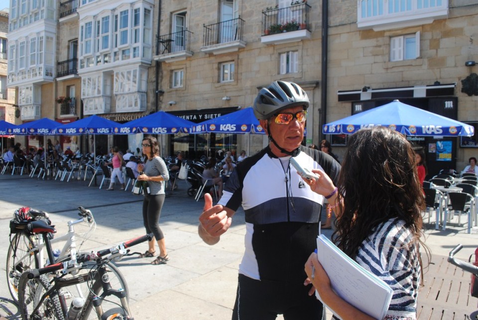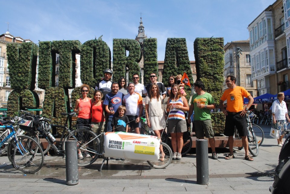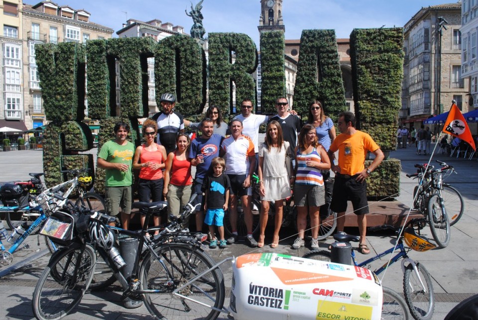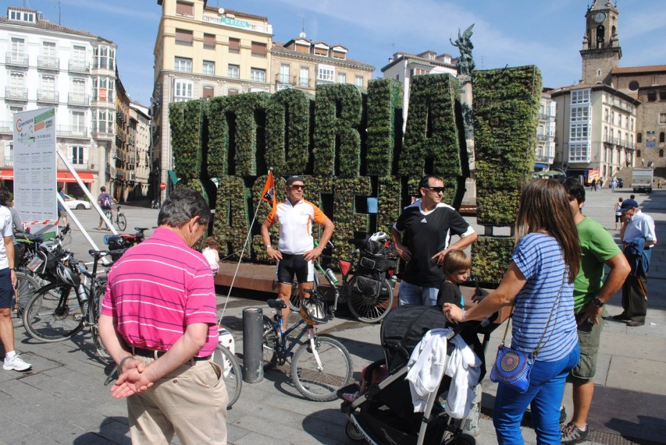 Nos encontramos en pleno centro de Vitoria-Gasteiz, la ciudad elegida este año Green Capital Europea (Capital Verde Europea). El pelotón de Sube a la bici es recibido por la concejala de Medio Ambiente, Idoia Garmendia.