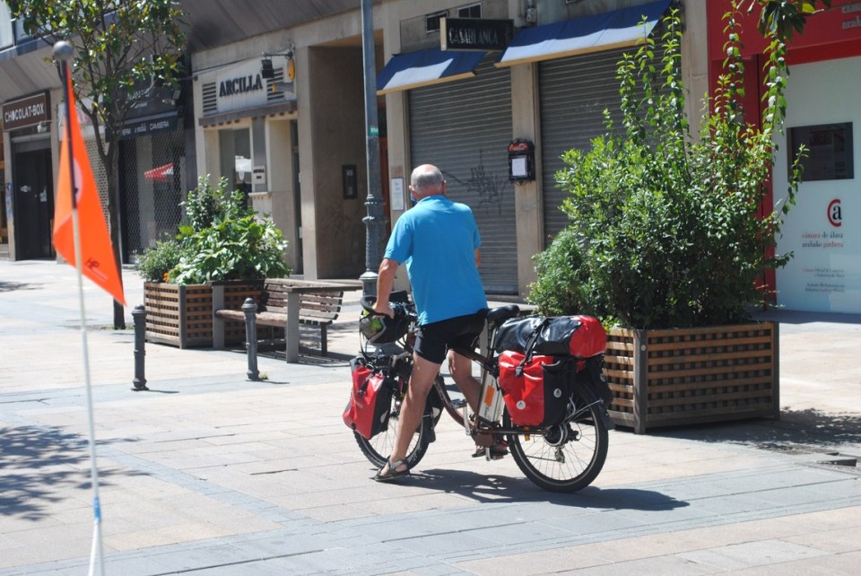 Miramos con rebeldía a un cicloturista extranjero que anda por las calles de Vitoria-Gasteiz.