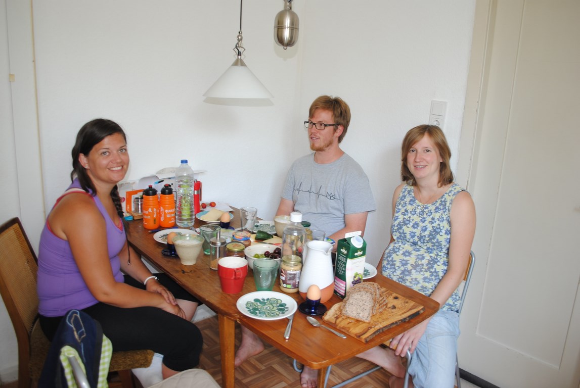 Hemos dormido en el jardín de la casa de Domino y Annia, de Couchsurfing. Ayer llegamos y nos dejaron entrar en el jardín y colocar la tienda de campaña mientras ellos estaban pasando el sábado con sus amigos. Justo cuando cenábamos aparecieron. Después de las presentaciones acabamos la cena y seguimos hablando con la joven pareja. Un poco más tarde nos duchamos y dormimos placidamente en la tienda de campaña. Esta mañana nos han despertado los pájaros. Para tomar fuerza nos han invitado a nuestro primer gran desayuno aleman. En la mesa había ademas de buena comida una buena conversación