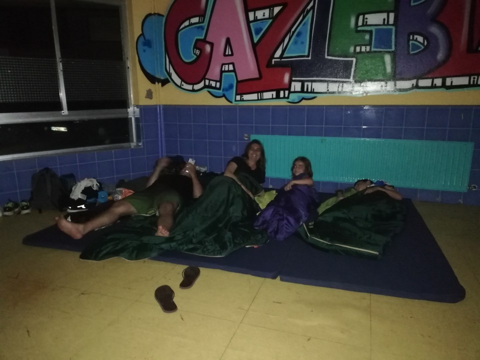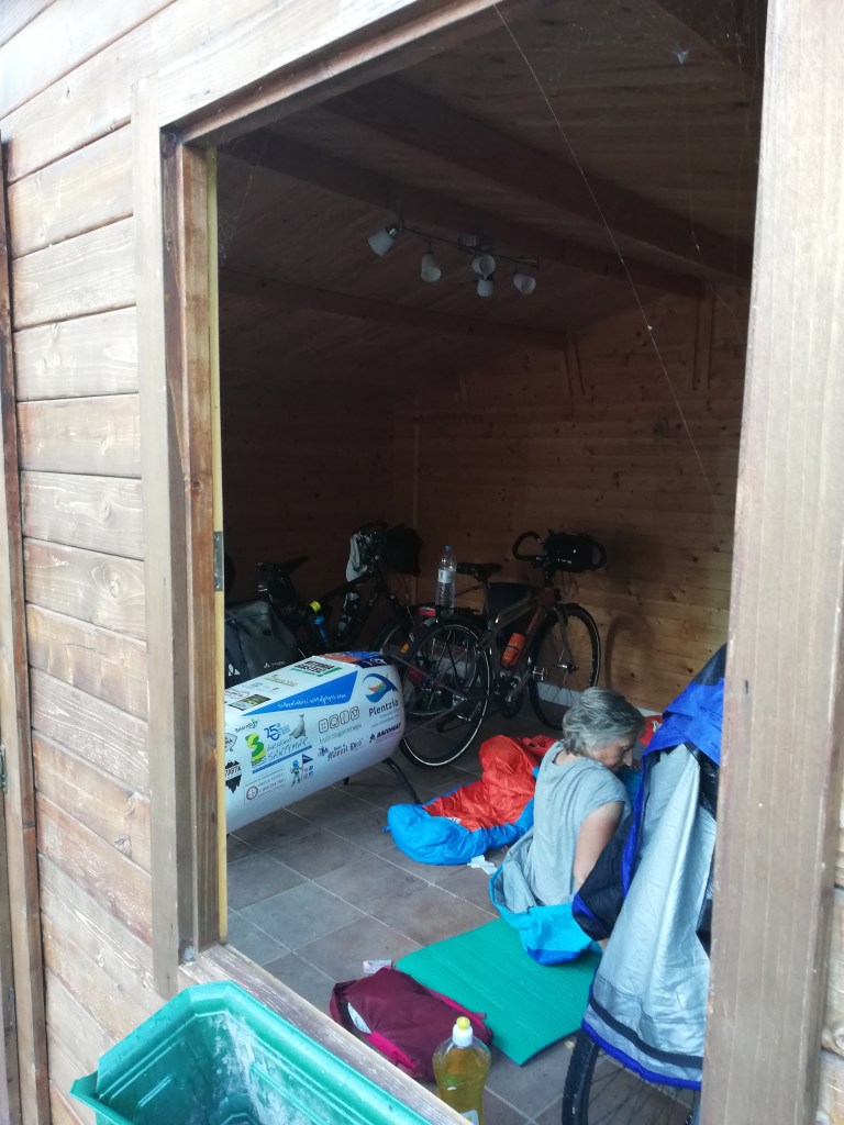 Llegue en el grupo de los rezagados, cerrando filas. Después de la cena y viendo que la lluvia no cesaba de caer hablamos con el personal del camping Igara y nos dieron permiso para pasar la noche en esta caseta de madera. Nos vino genial.