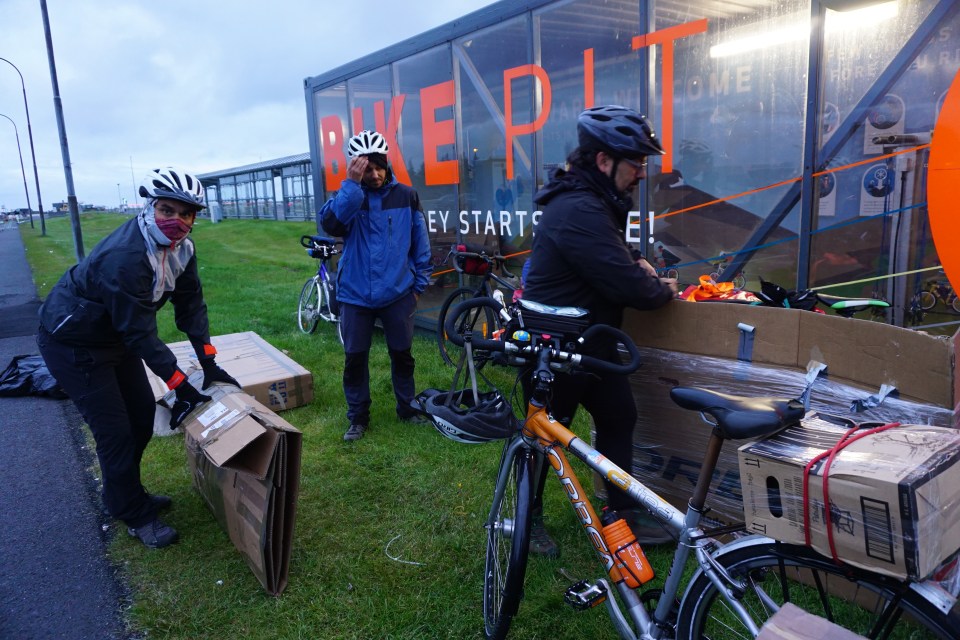 El aeropuerto de Reikiavik es una encerrona para los cicloturitas. Es cierto que hay facilidades pero todas pasando por «caja». El famoso Guesthouse Alex es una ratonera. Te recogen la bici, te la guardan hasta que te vayas y te quedas a dormir una noche. El precio se dispara por encima de lo 80 euros por persona. Nosotros buscamos un trastero donde guardar las diez cajas de cartón y nos sale a 14 euros por persona.