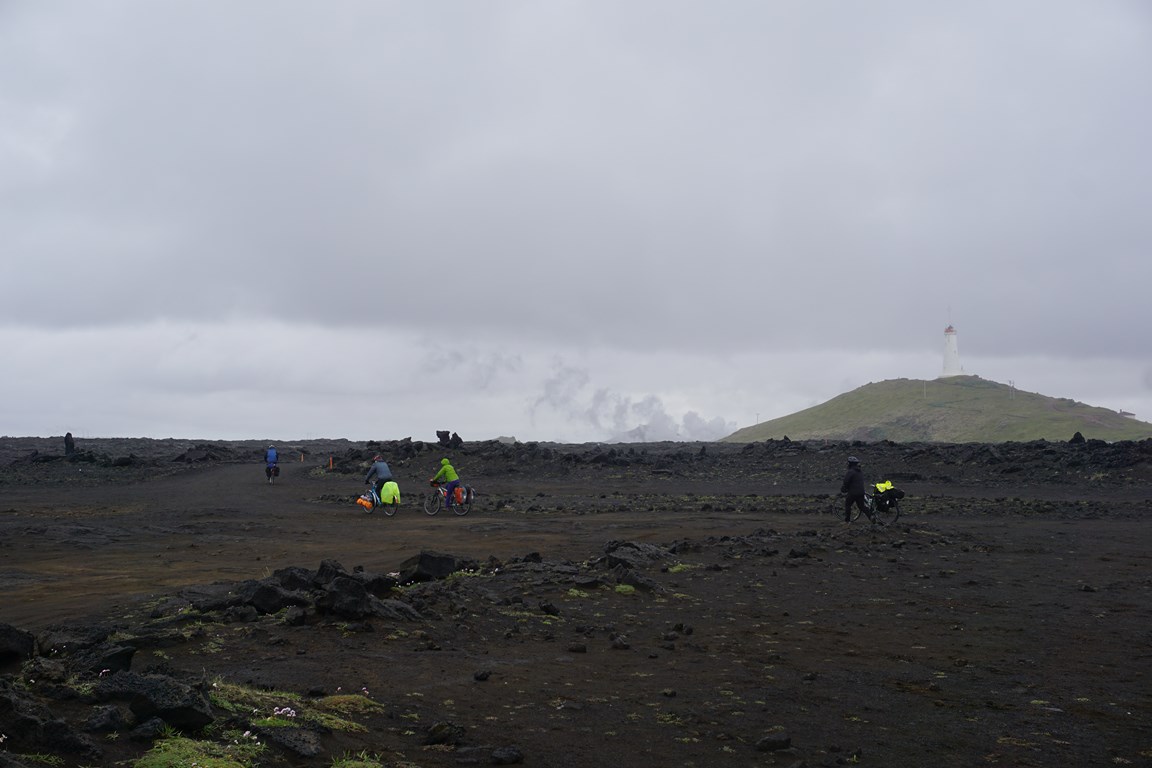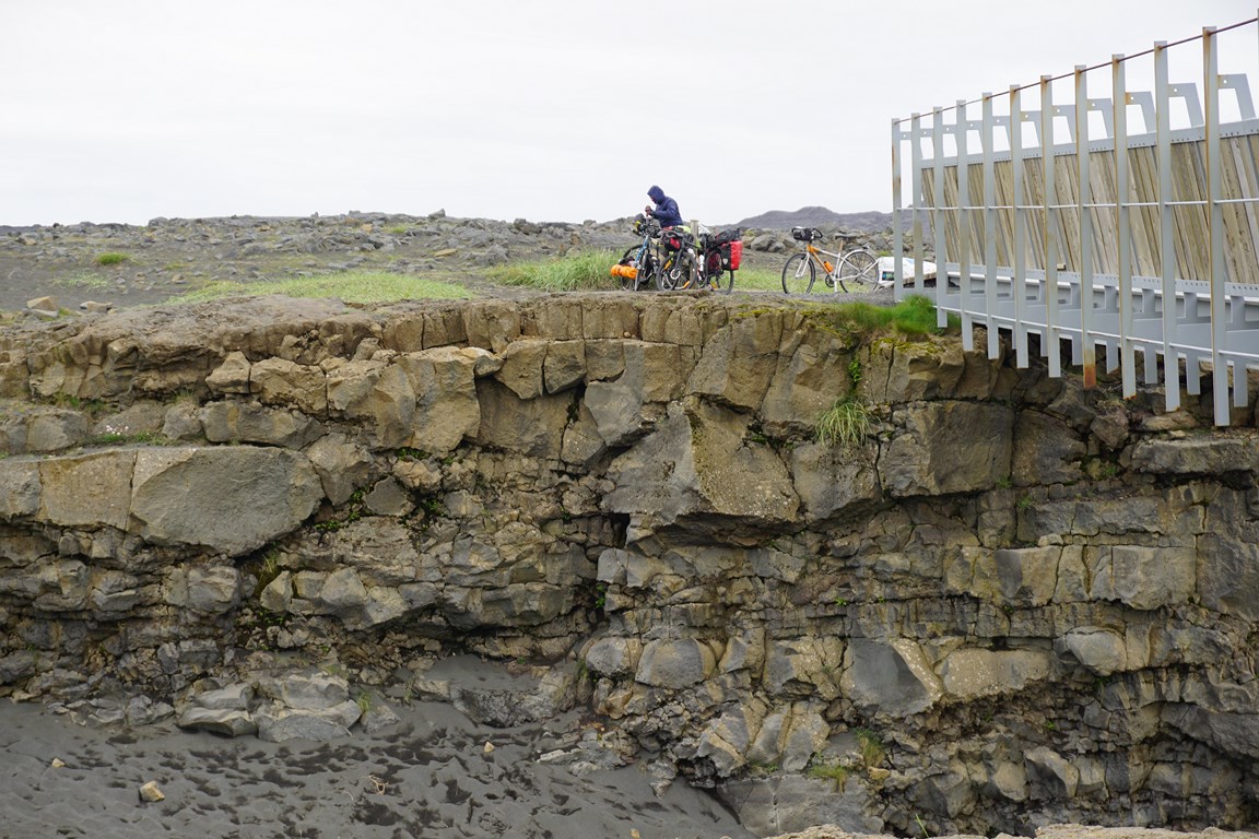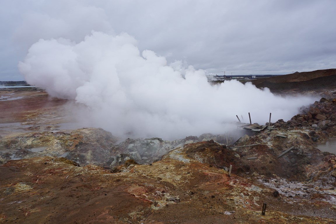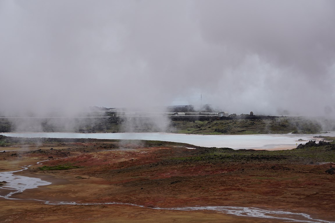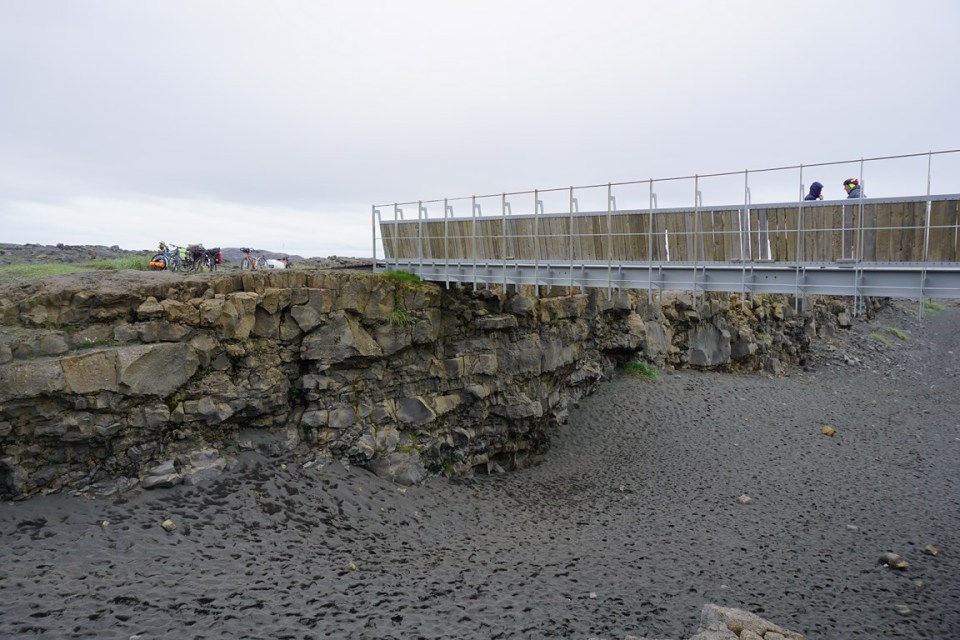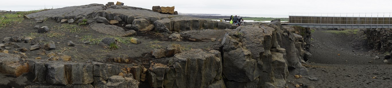 Al principio no nos sorprende mucho el paisaje. Al menos es una opinión generalizada en el grupo pero a los 25 km. todo cambia. aparece en el horizonte una central geométrica y detrás de ella unas fumarolas y en la otra dirección un faro y un acantilado. unos kilómetros antes de todo esto hemos parado en Hafnir. A nuestra izquierda hay un puente de unos 20 metros que une de forma simbólica las placas tectónicas Eurasiatica y Norteamericana.