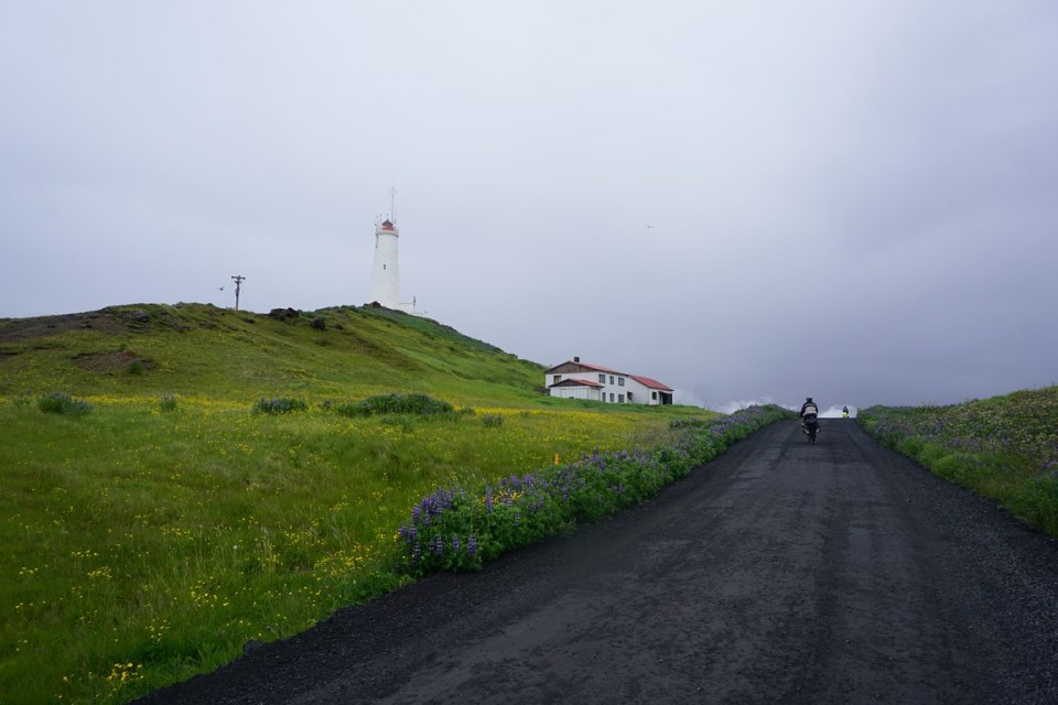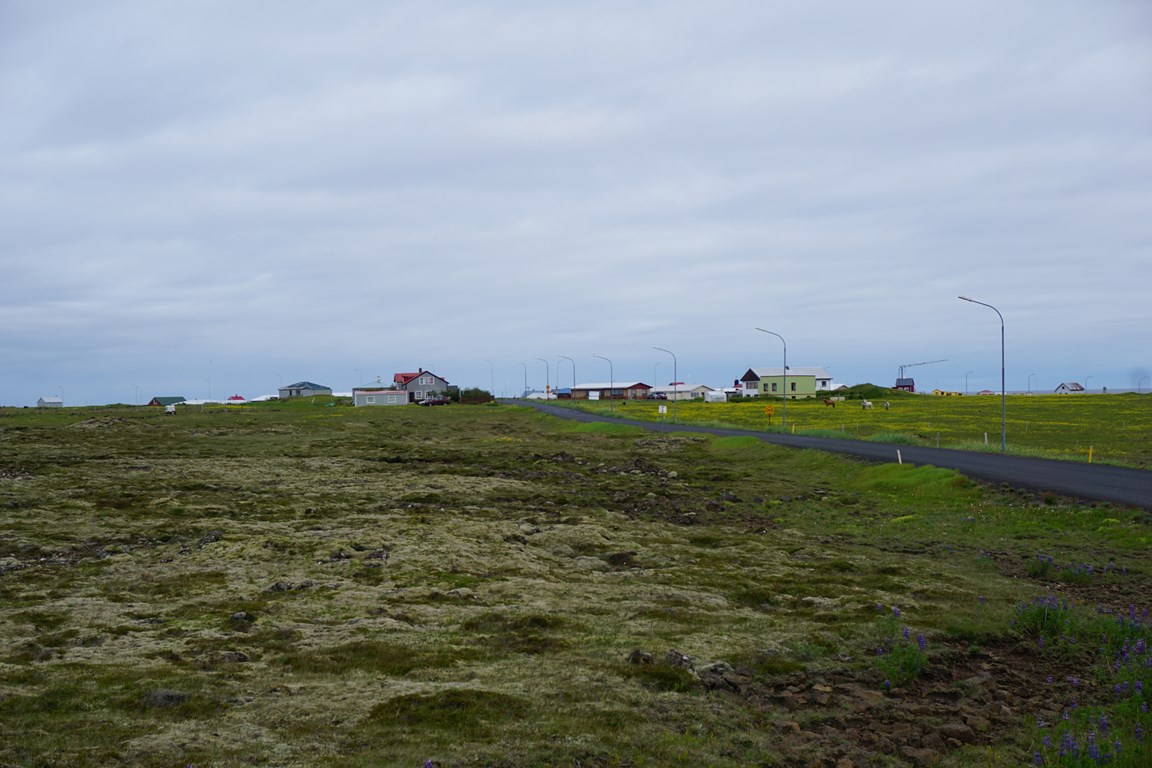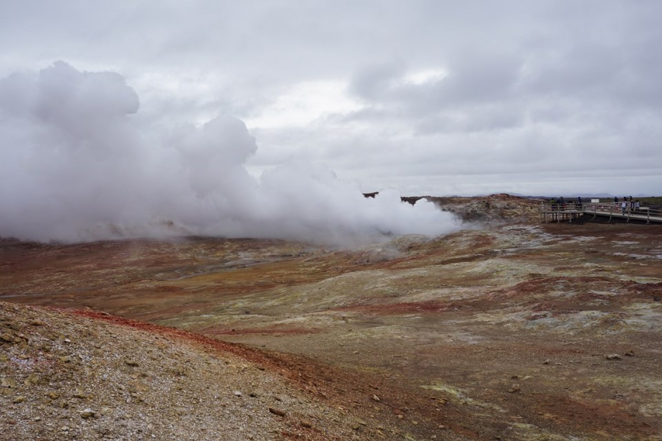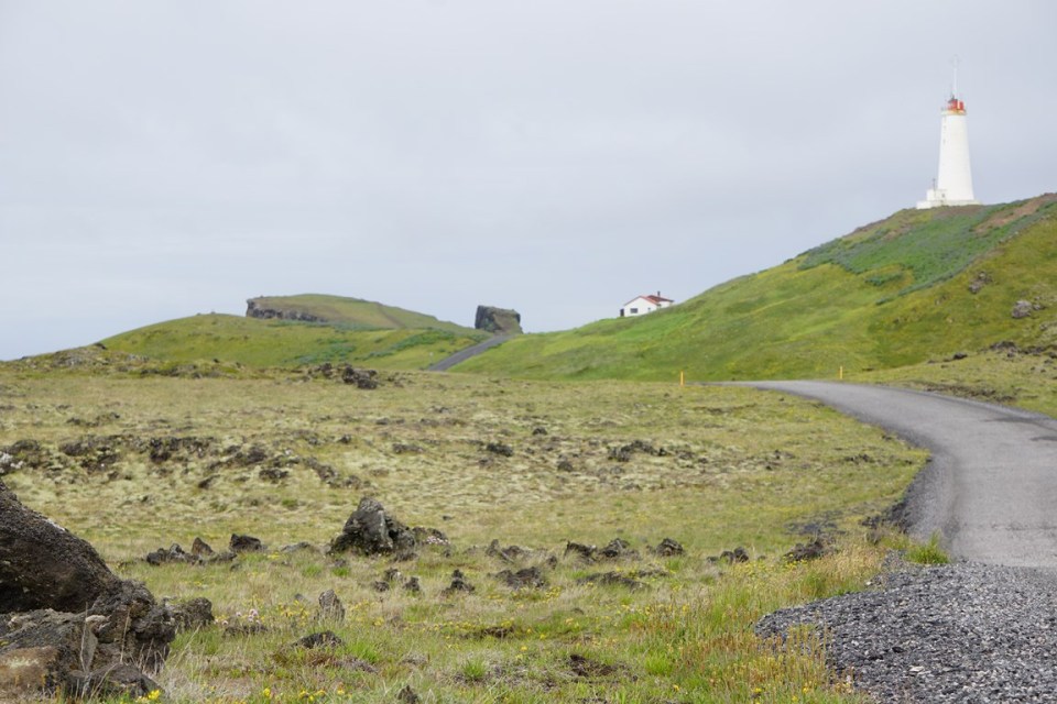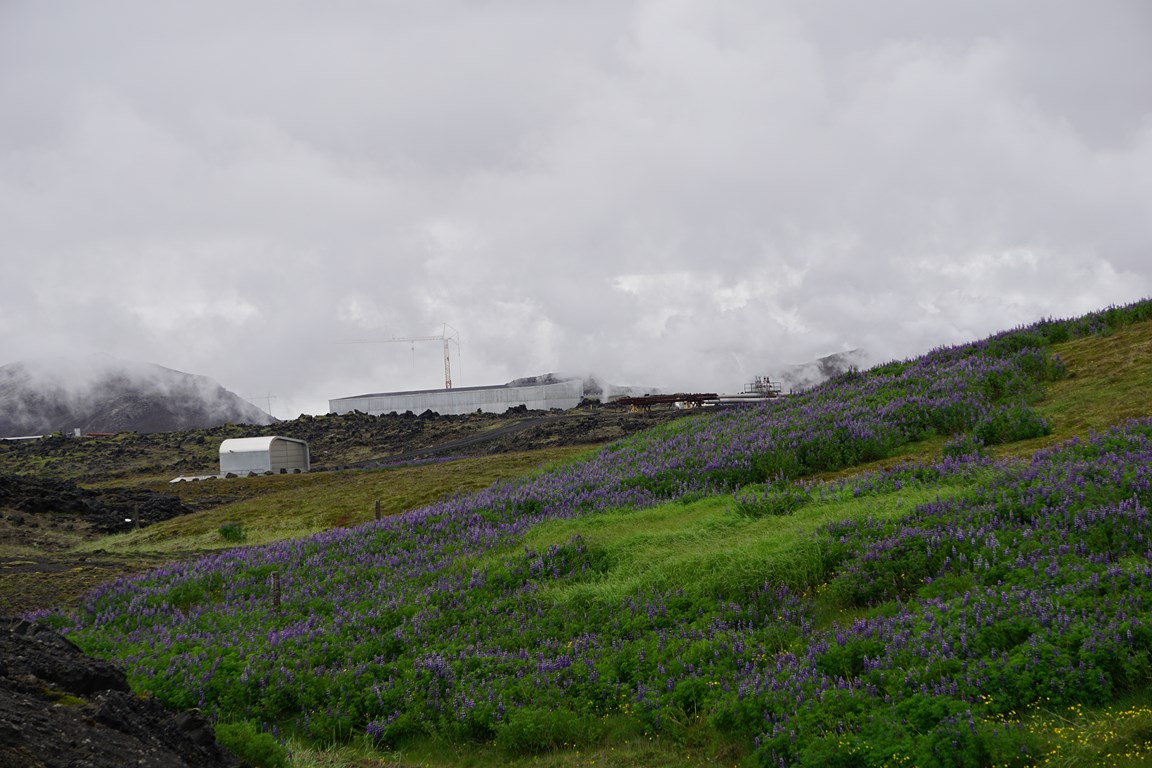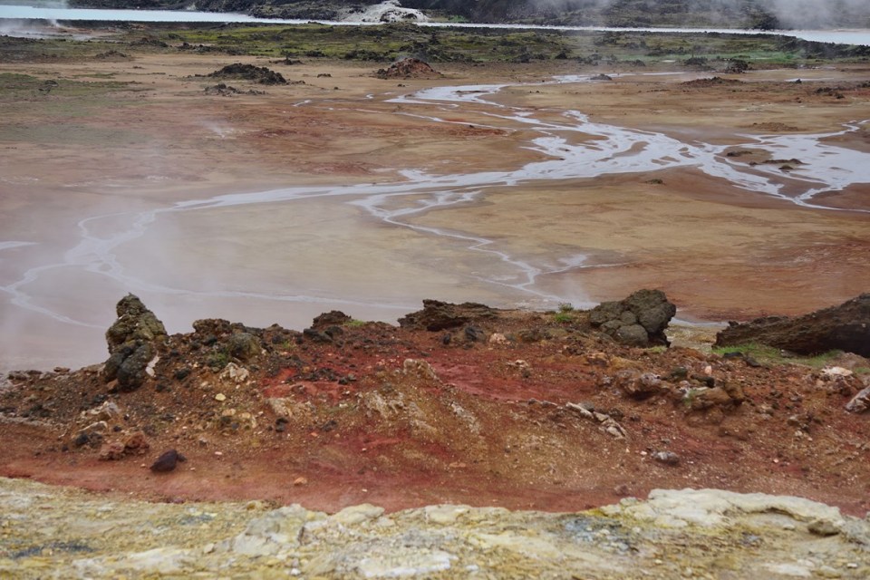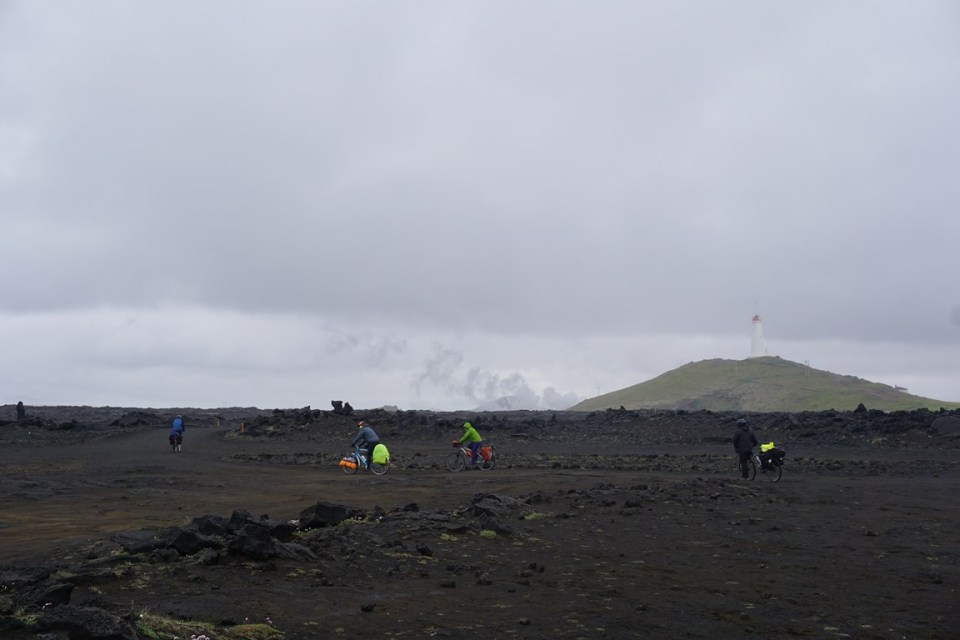 Al principio no nos sorprende mucho el paisaje. Al menos es una opinión generalizada en el grupo pero a los 25 km. todo cambia. aparece en el horizonte una central geométrica y detrás de ella unas fumarolas y en la otra dirección un faro y un acantilado. unos kilómetros antes de todo esto hemos parado en Hafnir. A nuestra izquierda hay un puente de unos 20 metros que une de forma simbólica las placas tectónicas Eurasiatica y Norteamericana.