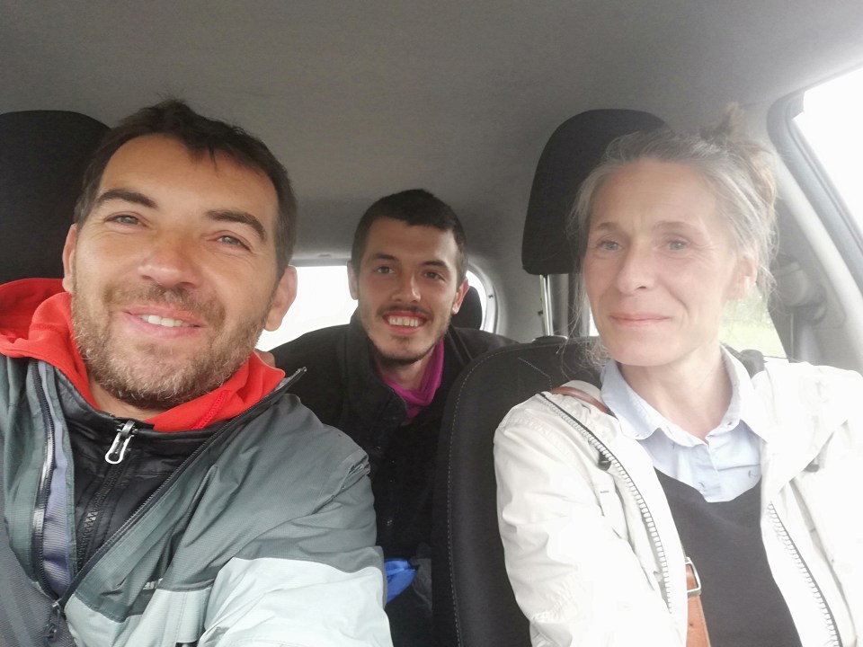 Con Karlota. Hace dos viajes para acercarnos a seis de nosotros al camping. Gracias